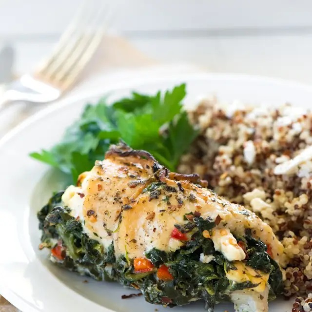 Just look at that golden brown chicken that’s wrapped lovingly around a perfect garlic-y spinach and feta cheese mixture. Take that, then bake it in a bath of Italian-seasoned chicken broth and butter and you have a unreal yummy + healthy dinner that is just irresistible- even for picky eaters!